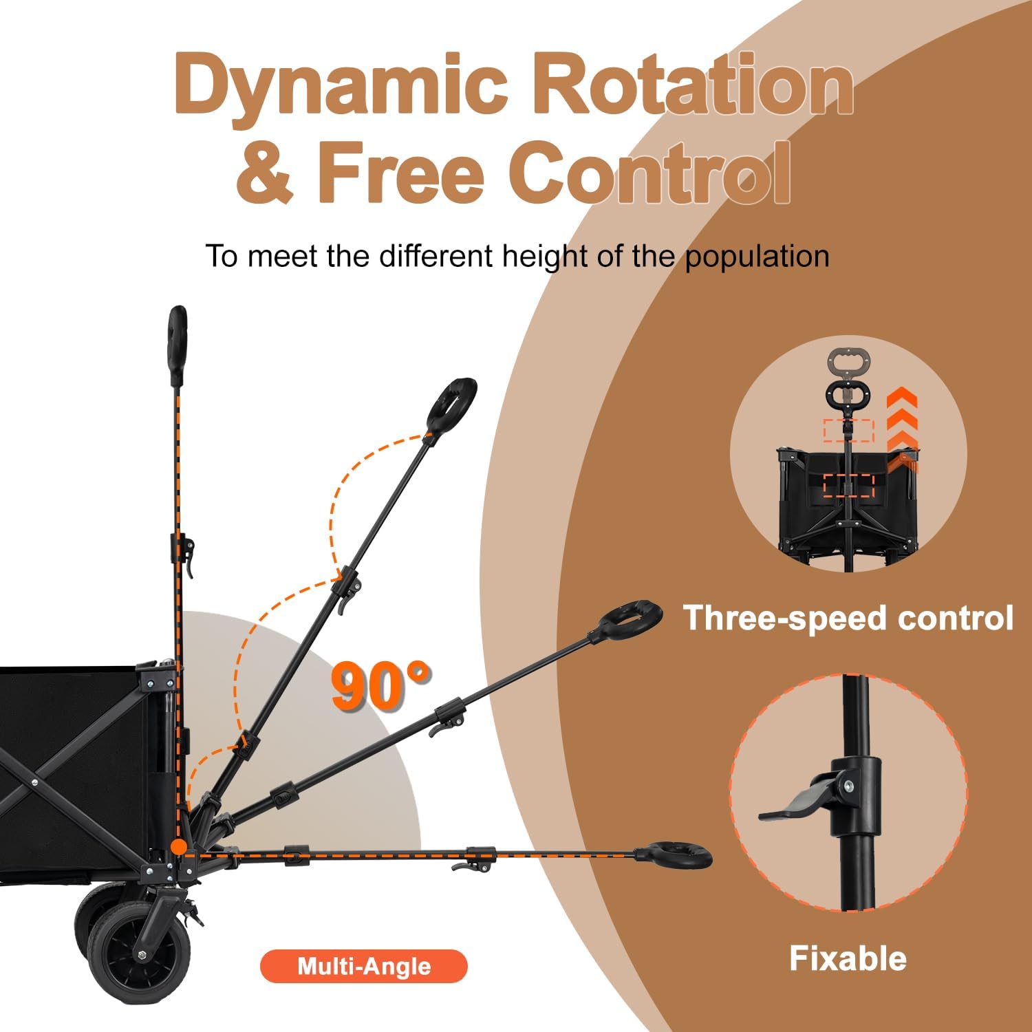 • Folding Wagon Cart-Flexible Maneuverability: The portable wagon is equipped with 360°swivel wheels and brakes for stability on slopes, You can go wherever you want to go, no matter how difficult the terrain is. The telescoping handle can be adjusted at any Angle, Accommodates people of different sizes, Even if your child wants to pull it, it's very easy