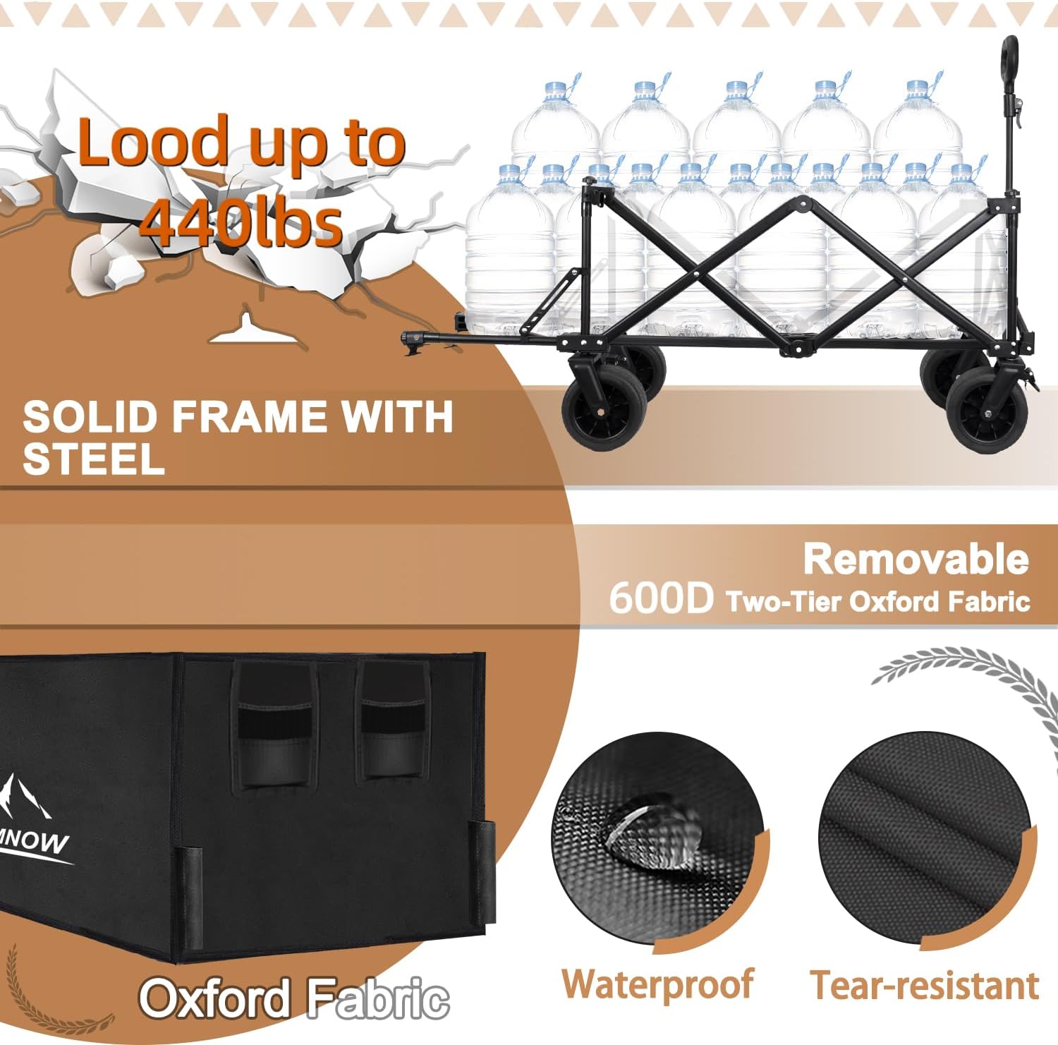 • Sturdy & Premium Quality: The grocery wagon supporting a weight large capacity of up to 440lbs, Constructed of a heavy-duty metal steel, Rust resistant and durable. This collapsible garden cart is made of 600D oxford fabric with PVC coating not only very easy to clean, also very wear-resistant and not easy to damage, even if you put sharp objects inside