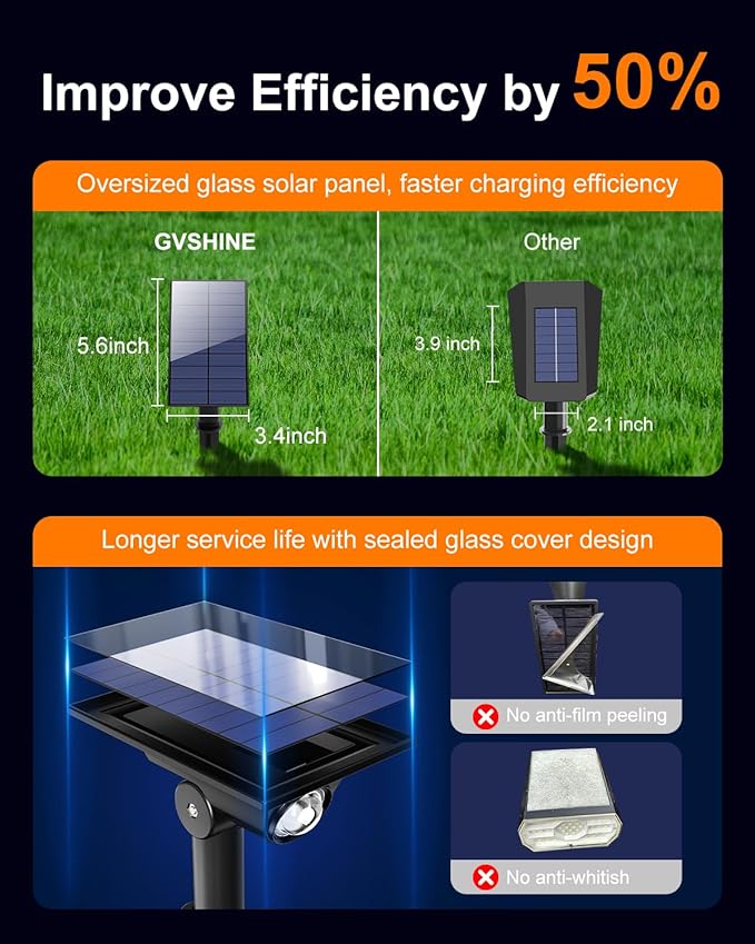 • High Efficiency with Large Glass Solar Panel: GVSHINE's outdoor solar spotlight features an oversized sealed glass cover design (5.6*3.4 inches). Unlike other spotlights with ordinary solar panels, our design prevents rapid aging and whitening of the solar panel from prolonged exposure to sunlight, ensuring proper functionality. Our solar spotlights equipped with a high-capacity 1800mAh battery, it charges for 5-6 hours during the day to provide 6-12 hours of illumination at night.
