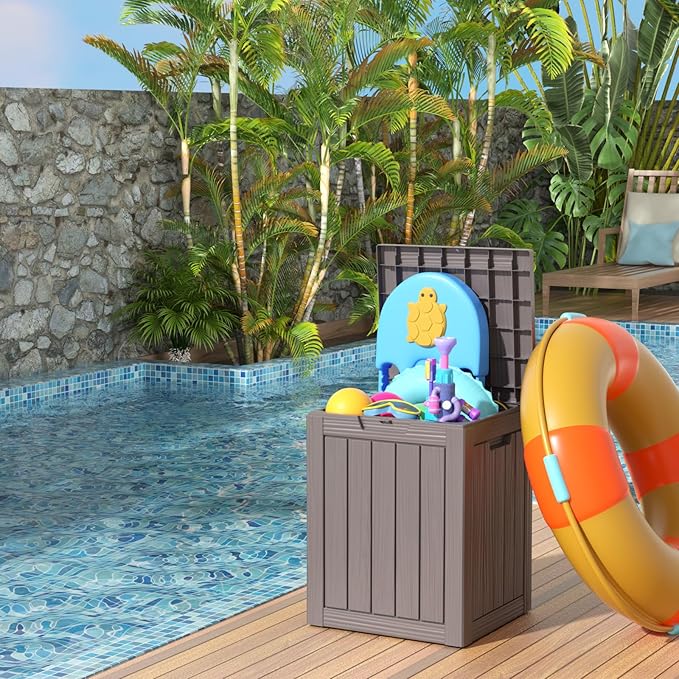 • BEAUTY MEETS DURABILITY: Featuring an aggregate resin with a wood grain pattern, this resin deck box offers an appealing look coupled with robust protection. It's resistant to water, UV rays, fading, rust, peeling, and warping, making maintenance nearly unnecessary for the coming years