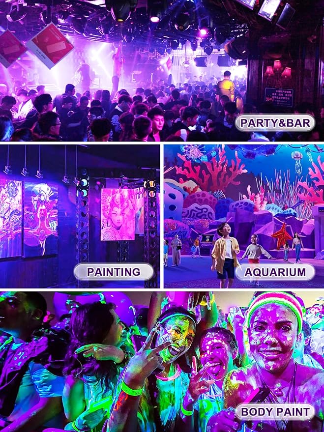 • 【Wide Application】Our blacklight fixture are perfect for indoor and outdoor activities, gallery, special effects, photography, birthday, wedding neon glow party, Aquarium, party, gym, DJ Booths, Outdoor Yard or Lawn, Christmas Halloween Decorations. IP66 waterproof suitable for outdoor indoor use.