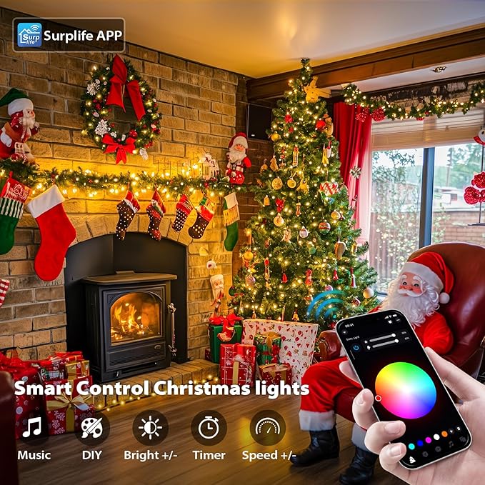 • EFFORTLESS CONTROL WITH REMOTE & APP: Experience the ultimate convenience with dual control options. Use the intuitive remote or seamlessly connect to smart Christmas lights dedicated "Surplife" app(available on both the App Store and Google Play) to adjust colors, switch between modes, and fine-tune brightness. Whether you’re hosting a gathering or unwinding at home, only transform with just a tap, making every moment feel special