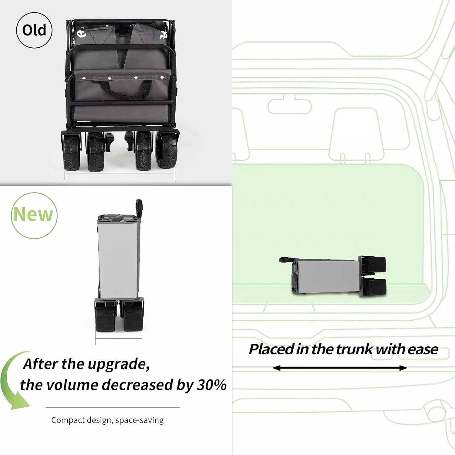 • 【Collapsible Folding Design】 No assembly required. With an internal pull rope design, the folding wagon cart can be folded effortlessly in one step, saving time and space. When unfolded, the wagon measures 38" x 21.6" x 27". When folded, it measures approximately 14" x 28" x 10" and weighs only 25 pounds, making it easy to carry.