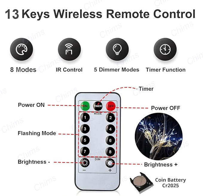 • [8 Lighting Modes & 10 Brightness Adjustable & Timer Setting] The Fairy light is controlled by the remote control. There are 8 lighting flash modes for you to choose. It has 10 brightness adjustment for different atmospheres, and a timer is available to set by remote.