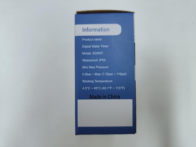 • IP55 Waterproof and Durable: The sprinkler controller operates effectively under water pressure ranging from 7.25 to 116 psi (0.5 to 8 bar) and temperature from 40.1 to 113°F (4.5 to 45°C). The included seal ring and PTFE tape help prevent leaks during use. The Irrigation timer is made of high-strength plastic and is IP55 waterproof to ensure a long life. It's ideal for outdoor use such as lawn, farm, garden, orchard, and greenhouse