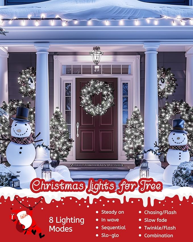 • 8 Lighting Modes: These led Christmas lights are waterproof, feature 8 lighting modes, including Combination, In waves, Sequential, Slow Glow, Chasing/Flash, Slow fade, Twinkle/Flash and Steady on. Just press the round button on the adapter to set up your mode to fit your Christmas/special holidays party decor. Popular cool white Christmas-color led string lights, light up a uniquely outdoor/indoor illuminated backdrop for your vivid and funny decorations