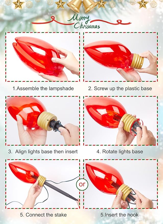 • Two Installation Ways: Minetom Super jumbo C9 christmas lights outdoor are not only as normal path lights decor your garden, yard, pathway, walkway, but also can be hanging on roof, window, fence with included hooks. These Christmas outdoor decorations lights are very easy to place it anywhere necessary