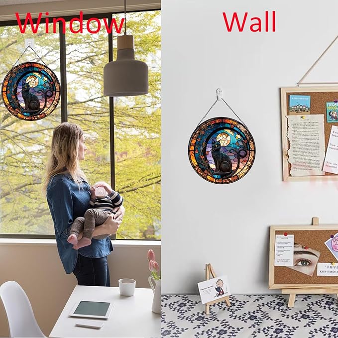 • 【Easy to Use】This stained glass window hanging painted maple leaf and black cat, vivid and full of vitality. Ideal for those who love pastoral and nature, and seek a return to original nature! You can hang it in the position you want to decorate,it's a great home decor.