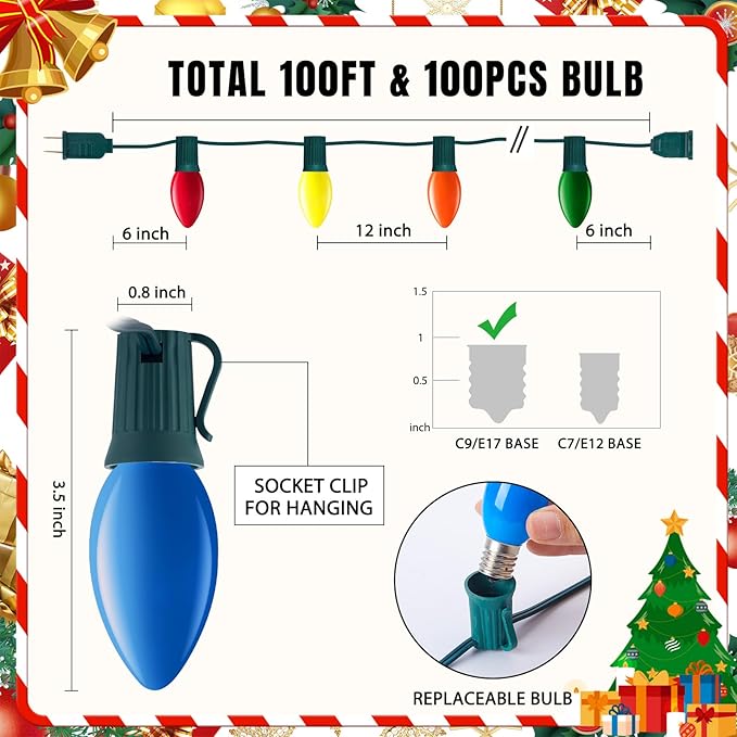 • 100 FT Vintage Outdoor Christmas Lights: 50 feet length with 50 +2 C9 bulbs (2 spare), E17 base light sockets.Multicolor
