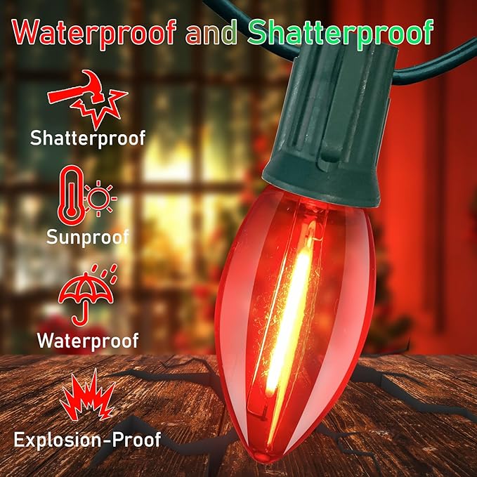 • 【Quick and Safe Setup】Installation is quick and simple with end-to-end connectors allowing you to link up to 28 sets. These UL-certified c9 christmas lights are safe to touch and maintain brightness even if one bulb goes out. Featuring a 6" lead, 12" spacing between bulbs, and a 6" tail, you can confidently set up your lights knowing they meet the highest safety standards.