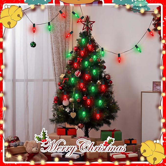 • Energy-Efficient Festive Lighting: Light up your holiday season with these vibrant clear red and green Christmas lights. Designed with E17/C9 candelabra socket bases for easy end-to-end connectivity, red and green outdoor christmas lights cover up to 25 feet with minimal effort. With each bulb operating at 7 watts and 120 volts, you'll enjoy brilliant illumination while keeping your energy costs down.