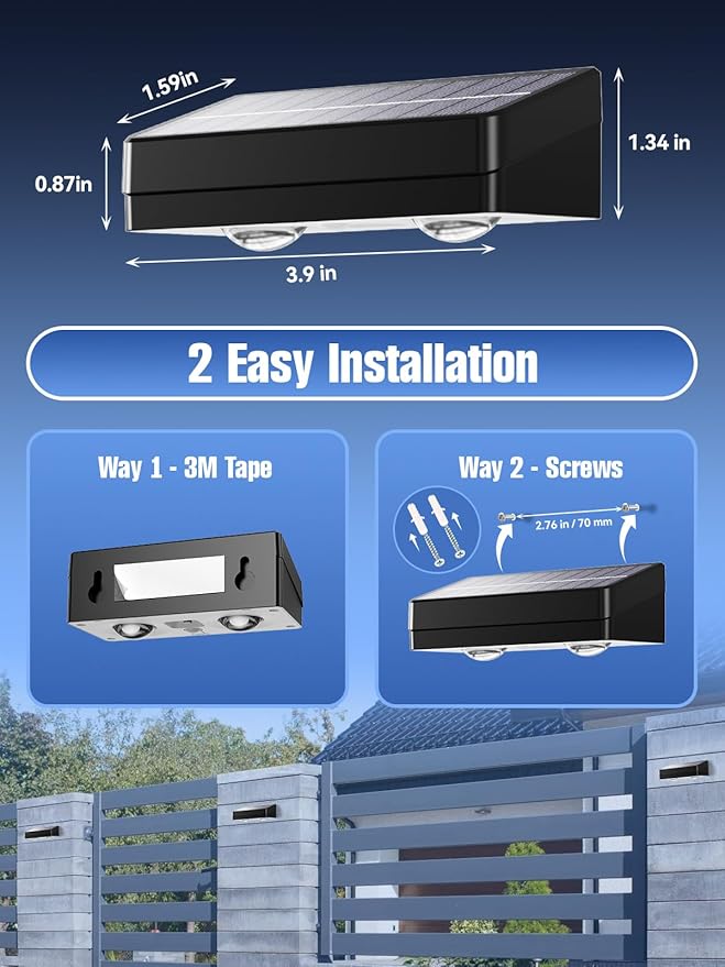 • 【2 Easy Installation Methods】Our solar fence lights outdoor waterproof led can be securely mounted using the included screws or 3M tape. Installation instructions are provided for your convenience. They can be installed within minutes on surfaces such as wood, metal, vinyl, or concrete, meeting the installation requirements of various environments. No electrical wiring or professional electrician is required for installation, which saves on labor costs