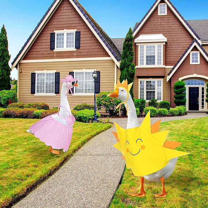 • Aesthetic and Stylish: featuring a delightful summer design in vibrant colors of yellow and pink, the goose outfits for cement goose will draw attention and add a visually appealing detail to your lawn or garden; Dressing up your goose transforms ordinary lawn fixtures into eye catching garden centerpieces