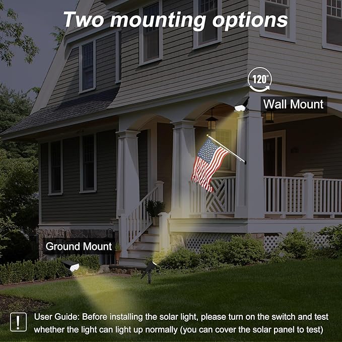 • 【Eco-friendly & easy installation】This solar spotlight stores solar energy for lighting and is versatile, no cables to lay and takes less than 30 seconds to install! Then feel free to illuminate landscapes, pathways, trees, bushes, flags, house facades and more!