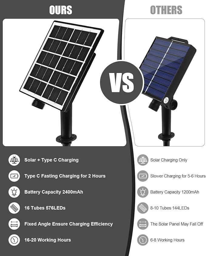 • Easy Operation: The solar panel collects sunlight throughout the day, automatically activating the solar lights at dusk and deactivating them at dawn, ensuring hassle-free operation and energy efficiency. feature a rechargeable 1XAA 1.2V 2400mAh Ni-MH battery, it can be charged with type C cable in rainy and cloudy days
