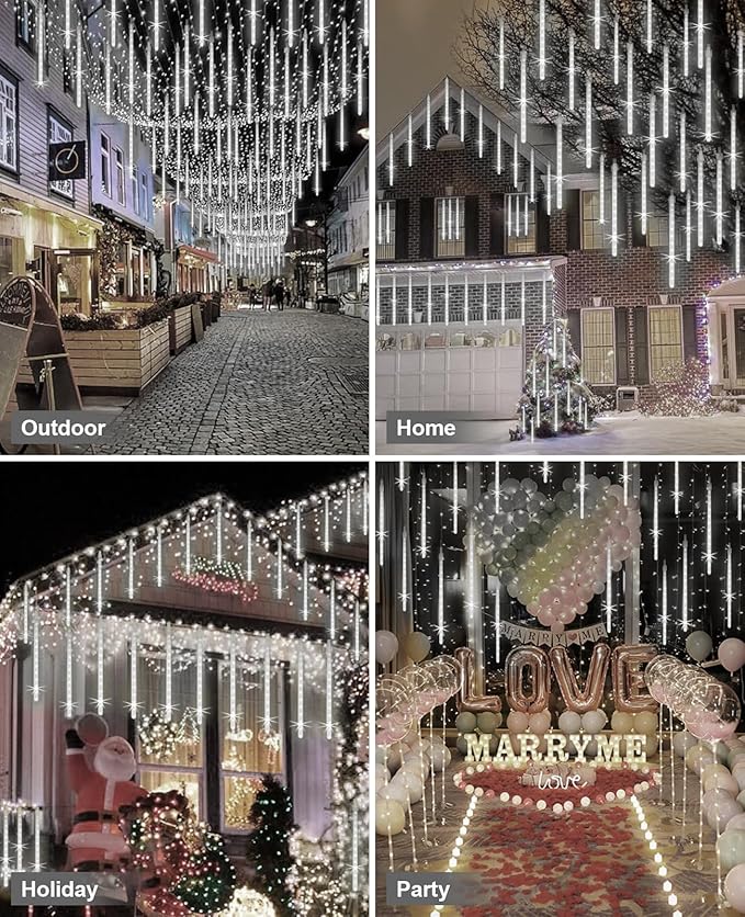 • Easy to Install and Versatile: Our Cascading lights are lightweight and come with hanging holes, making them easy to hang. They can be used as falling rain light, icicle snow fall lights, rain drop string light, and more. The LED lights flash one by one, alternating in cycles, creating a festive atmosphere for Christmas, Halloween, garden, shopping mall, wedding, eaves, yard tree, and more. No matter what scene you want to decorate, these meteor lights will be your ideal choice