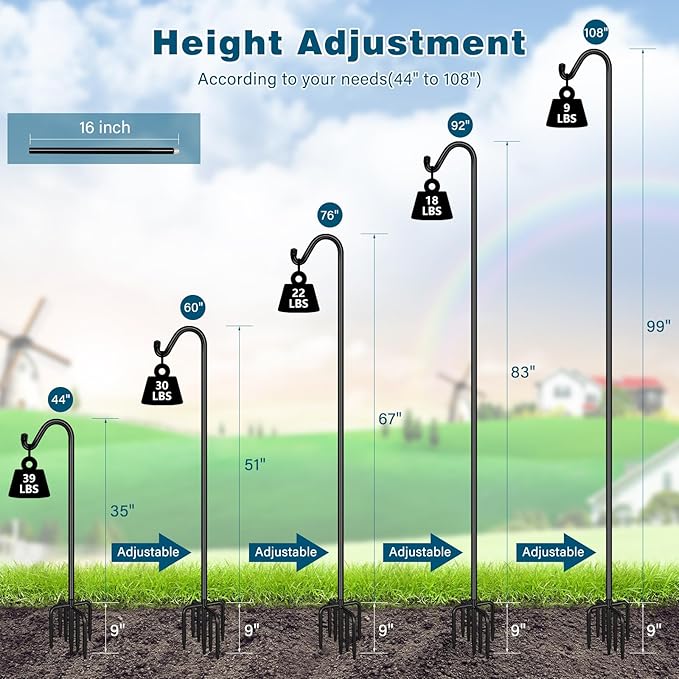 • 【HIGH QUALITY & ADJUSTABLE】 The height of the shepards hooks for outdoor is 108 inch and the diameter is 5/8 inch. Our garden hook is made of high quality iron, the black coating on the surface is rust resistant. The height of the shepherds hook for bird feeder can be adjusted by adding or reducing the pole sections, each pole section is 16 inch. So you can adjust the height to 92 inch, 76 inch, 60 inch and 44 inch.
