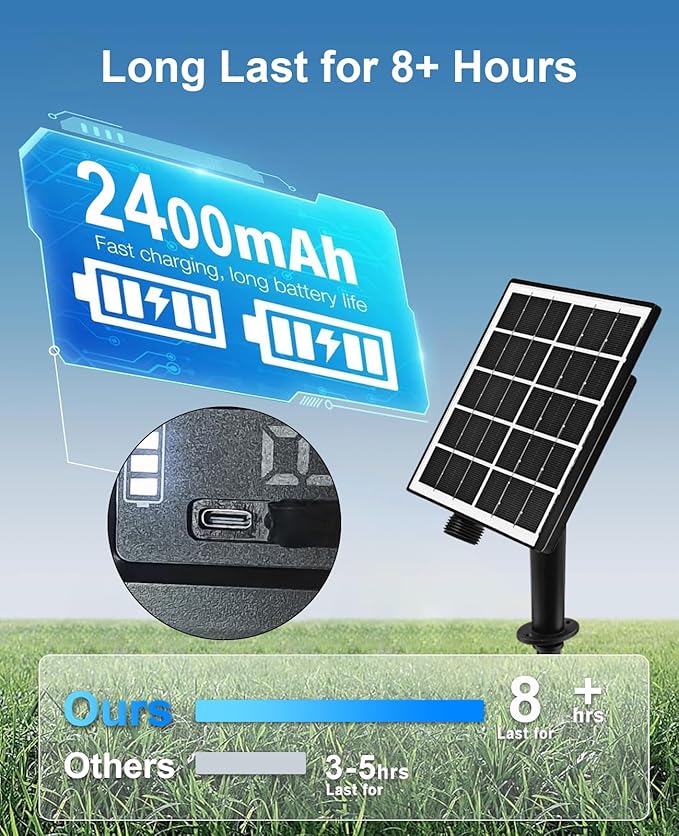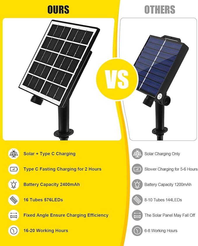• Easy Operation: The solar panel collects sunlight throughout the day, automatically activating the solar lights at dusk and deactivating them at dawn, ensuring easy operation and energy efficiency. feature a rechargeable 1XAA 1.2V 2400mAh Ni-MH battery, it can be charged with type C cable in rainy and cloudy days