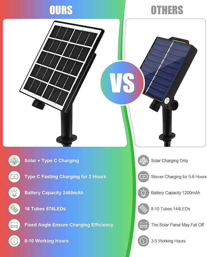• Energy-Saving & High Efficiency: The meteor shower lights are powered by solar energy, eliminating the need for additional utility costs and battery replacements. With a full charge achieved under 6-8 hours of direct sunlight, the single color solar meteor lights can provide illumination for up to 16-20 hours at night, and multi-color solar meteor lights can work up to 8-10 hours