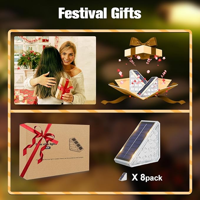 • Stylish & Functional: Illuminate your steps with our step lights outdoor, designed to cast a bright beam that ensures every inch of your stairs is clearly visible, reducing the risk of accidents or falls. These solar lights for steps outside also elevate the aesthetic appeal of your patio, enhancing the overall appearance of your outdoor space. Don’t settle for ordinary lighting—upgrade to our solar stair lights for the perfect blend of style and functionality.
