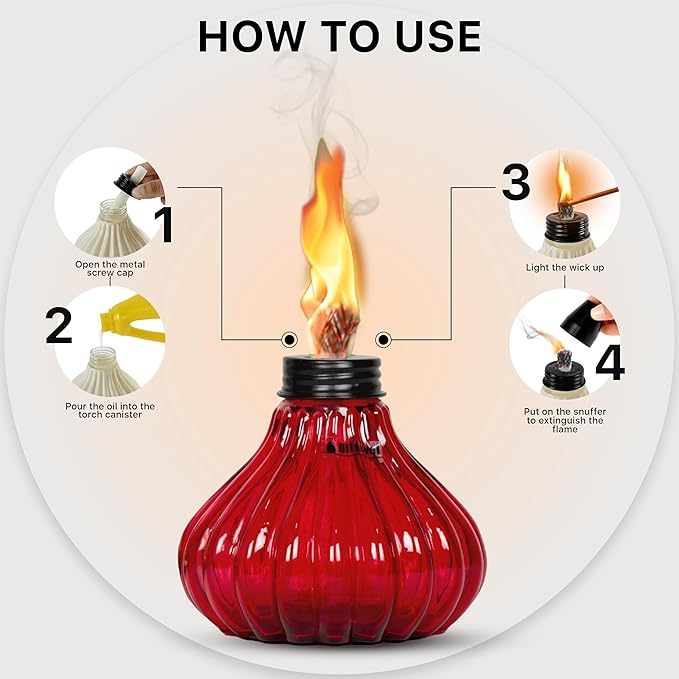 • EASY TO REFILL & USE: Just open the top cap of the table torches to replenish the torch oil every time you need a refill. Besides, you can use the snuffer cap to extinguish the torch's flame and protect the wick after use. When not in use, these table torches are perfect for decorations during outdoor gatherings, camping, etc.