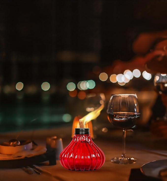 • 3 PACK GLASS TABLE TORCH: Deco Window presents set of 3 citronella lantern table-top torches in pumpkin design that comes with a long-lasting fiberglass wick & metal snuffer, and delivers up to 6 hours of burn time per fill. These torches are perfect for indoor, yard, garden, lawn, terrace and porch light during casual days and decoration.