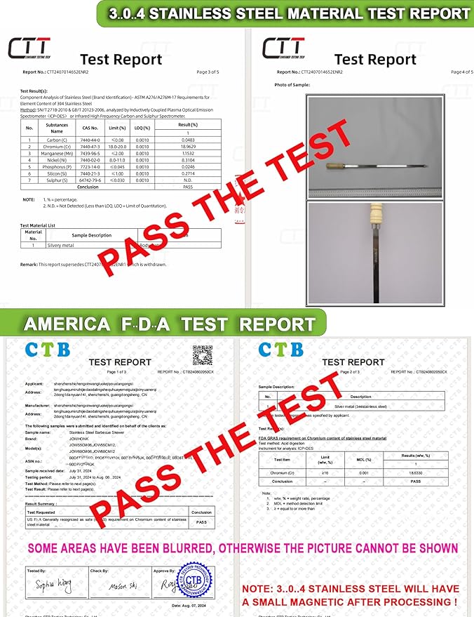 • 【304 STAINLESS STEEL HAVE WEAK MAGNETISM】304 stainless steel may have weak magnetism because during the processing and forging process of the product, a small amount of austenite is converted into martensite, so 304 stainless steel may have a little magnetism,which is a normal phenomenon.We have America F..D..A test report and 304 stainless steel material test report, you can buy and use securely.