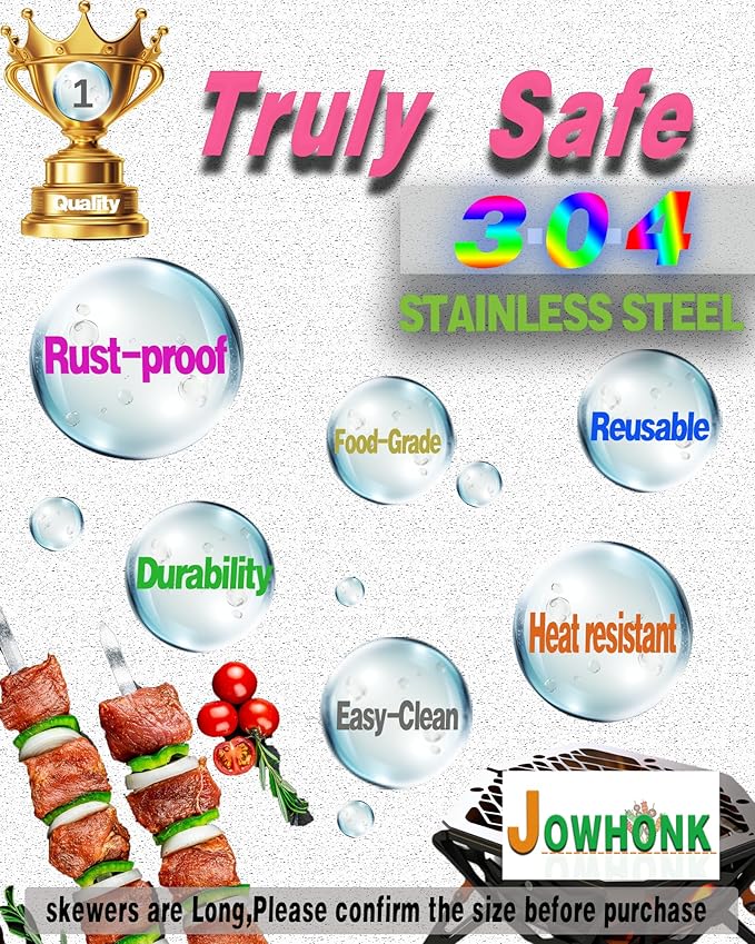 • 【FOOD GRADE 304 STAINLESS STEEL】JOWHONK BBQ 304 stainless steel skewers for grilling are 21.5 inches long,0.4 in width,0.07 in thickness. Our wooden handle flat metal skewers for kabobs are made of premium 304 stainless steel, Ensuring non-rust long time durability, Heat resistant and non-poisonous,Harder than other stainless steel and iron.It's safety for children.Our Premium Stainless steel Barbecue skewers are reusable. The BBQ kabob skewers surface is smooth that grilled food residue won't get stuck onto the kabob skewer blade.