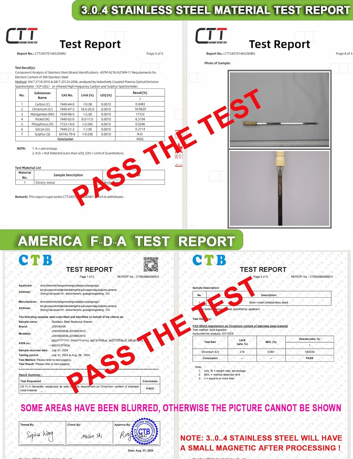 • 【304 STAINLESS STEEL HAS WEAK MAGNETISM】304 stainless steel may have weak magnetism because during the processing and forging process of the product, a small amount of austenite is converted into martensite, so 304 stainless steel may have a little magnetism,which is a normal phenomenon.We have America F..D..A test report and 304 stainless steel material test report, you can buy and use securely.