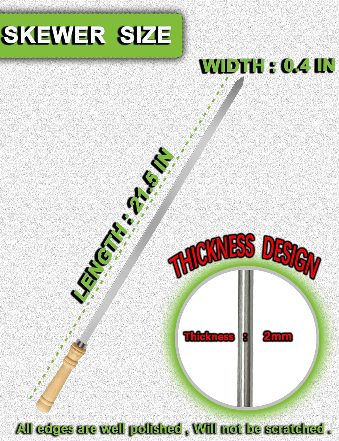 • 【FOOD GRADE 304 STAINLESS STEEL】JOWHONK BBQ skewers for grilling are 21.5 inches long,0.4 in width,0.07 in thickness. Our wooden handle flat metal skewers for kabobs are made of premium 304 stainless steel, Ensuring non-rust long time durability, Heat resistant and non-poisonous,Harder than other stainless steel and iron.It's safety for children.Our Stainless steel Barbecue skewers are reusable. The BBQ kabob skewers surface is smooth that grilled food residue won't get stuck onto the kabob skewer blade.