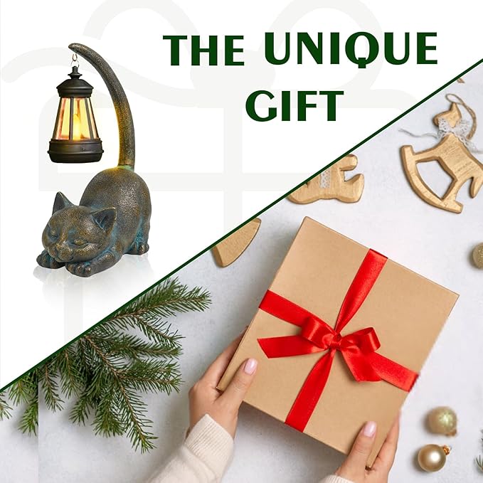 • Original Design: The size of the cat garden statue is 3.94''(W) x 6.69''(D) x 10.03''(H). Bronze cat with delicate textures and a lantern dangling from its tail. The light from the lantern mimics a vivid small flame and flickers in the darkness. NOTE: The cat's tail comes disassembled in the package and needs to be assembled for use.