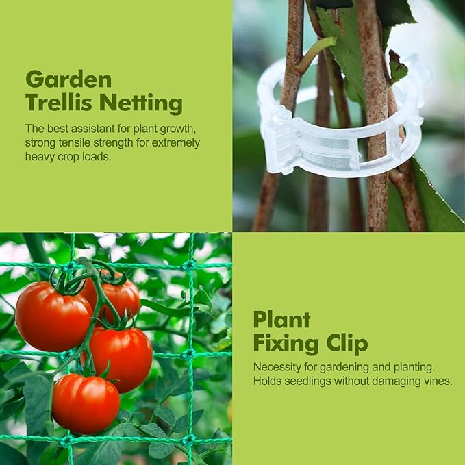 • Weather-Resistant Material: The cucumber trellis is made of durable plastic-coated steel, which is rustproof and waterproof; The sturdy nylon netting and plant fixing clips ensure strong support for climbing plants