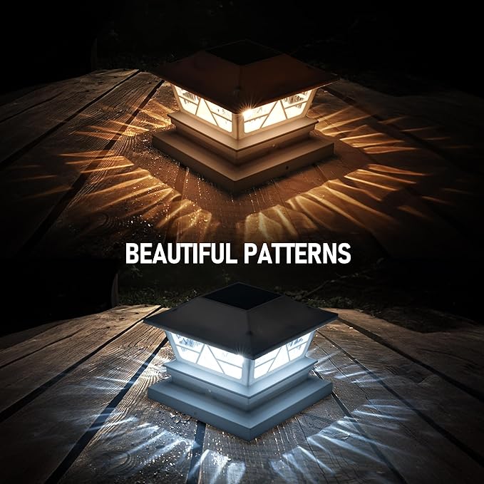 • Dual Color Options: These solar lights for deck posts feature two color modes, allowing you to choose between white and warm white. Equipped with LED beads, our solar-powered fence post lights emit a bright 15-lumen glow as dusk approaches, making them perfect for illuminating outdoor areas.