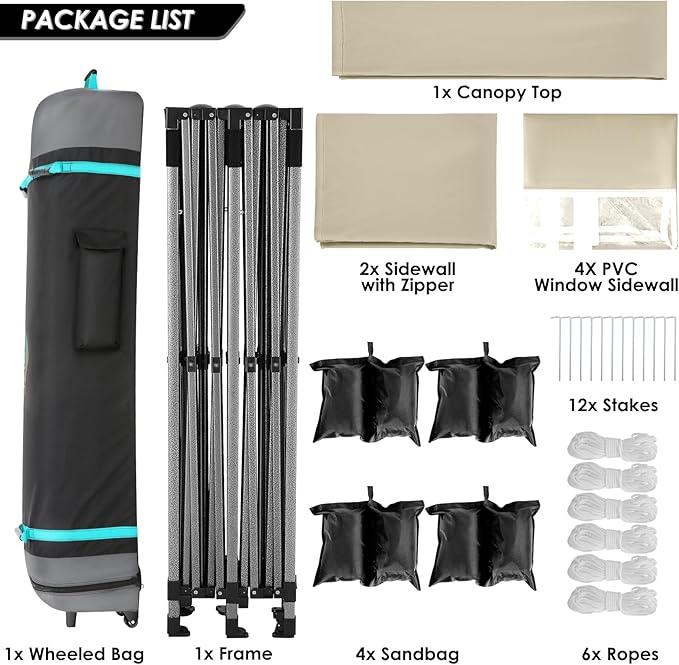 • 【Package Includeds】1x 10x20 Folding Frame, 1x Top cover, 6 x Sidewalls ( 2 Sidewall with Zipper and 4 Sidewall with Window ), 6x Sandbags, 12x Stakes, 6x Ropes, 1x Roller bag, 1x Manual. If you have any questions, please contact us