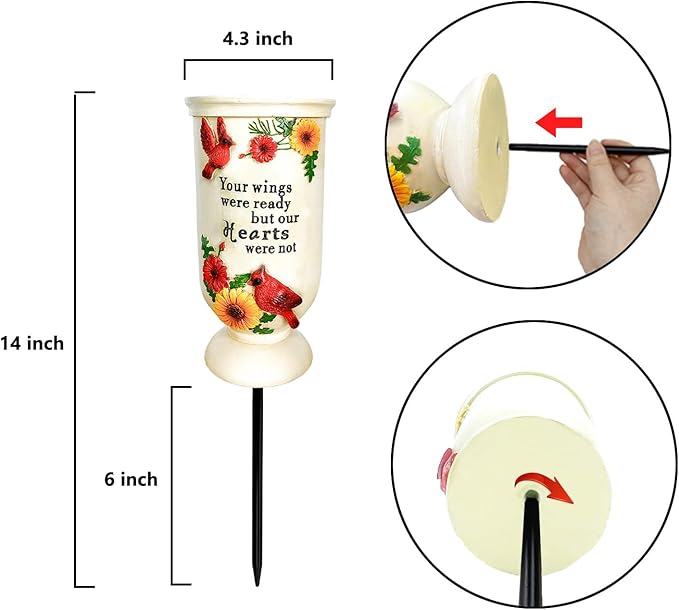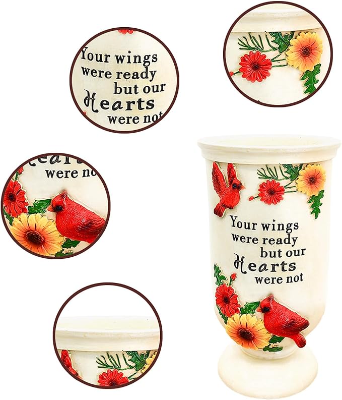 • Cemetery Flowers Vases: Cemetery decorations for grave are lovely way to honor a loved one. The lovely sentiment reads, “Your wings were ready but our hearts were not” The design of the cardinal creates a beautiful, uplifting element. Commemorate your lover with our sympathy gift!