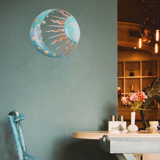 • PERFECT SIZE: With dimensions of approximately 28x28cm/11.02x11.02inch,our outdoor sun metal decor offers the perfect size for both indoor and outdoor use.Its light blue color creates a rustic and retro ambiance,enhancing any environment it is placed in.Experience the charm and elegance of this art piece.