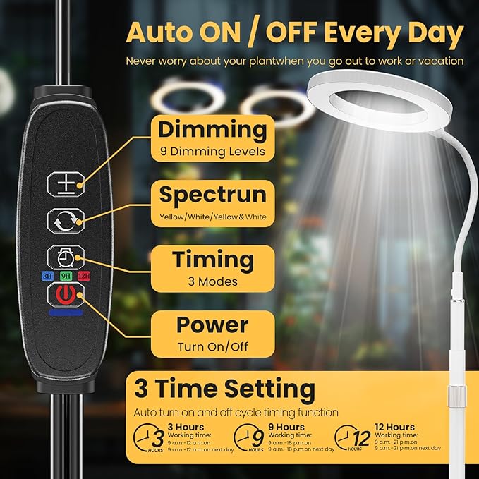 • Three cycle timing settings, this plant light will automatically turn on/off according to your desired schedule every day: 3/9/12H.