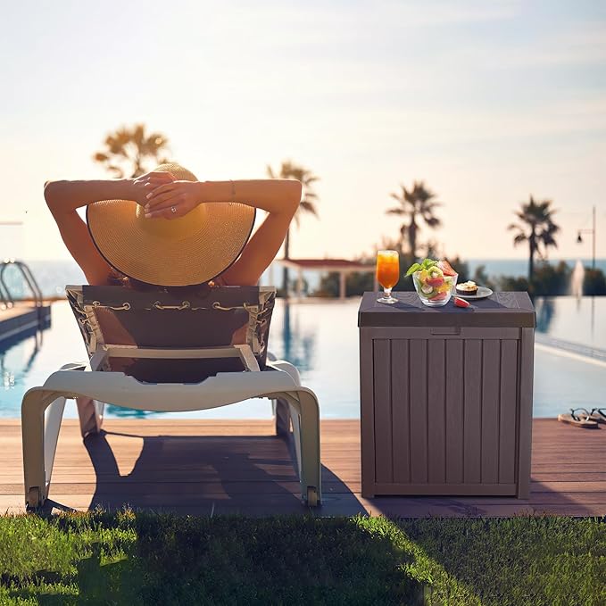 • Dimensions: Deck box’s overall dimensions: 22"L x 22" W x 24"H; with a 51 gallon storage capacity, this resin deck box provides plenty of space to store outdoor essentials such as tools, cushions, and pool accessories.