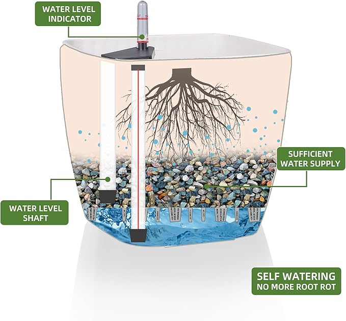 • SELF WATERING & NO MORE ROOT ROT - The smart unique sub-irrigation system is one of the most appealing aspects among all Dexceder planters. The easy-to-use separated integrated water reservoir or catcher- keeps your soil well aerated and automatic supplies plants with the right amount of ongoing moist air & nutrition for optimal growth. The insert indicator shows you the exact time to water again. The full water supply period can single-handedly last over 3 weeks based on different live plants