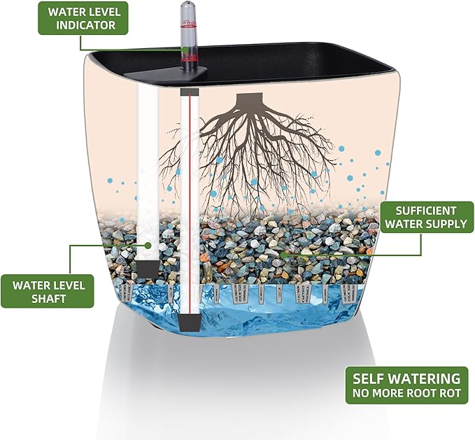 • SELF WATERING & NO MORE ROOT ROT - The smart unique sub-irrigation system is one of the most appealing aspects among all Dexceder planters. The easy-to-use separated integrated water reservoir or catcher- keeps your soil well aerated and automatic supplies plants with the right amount of ongoing moist air & nutrition for optimal growth. The insert indicator shows you the exact time to water again. The full water supply period can single-handedly last over 3 weeks based on different live plants