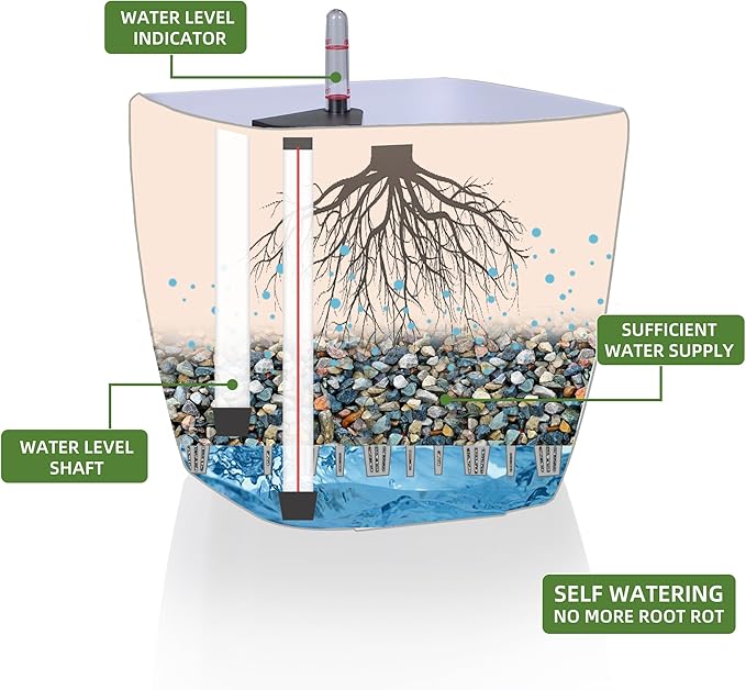 • NEVER MISS WATERING AGAIN - The hydroponic device keeps water ready, then watering time is at your discretion on the gauge. The design of drainage plug and spillway hole is to avoid cycles of overwatering and underwatering, pull out the plug to drain the excess water on rainy days outdoors. The sufficient water supply system enables double the water-efficient than conventional pots. Don't be anxious about missing watering while you enjoy a long term holiday on a journey or travel outside