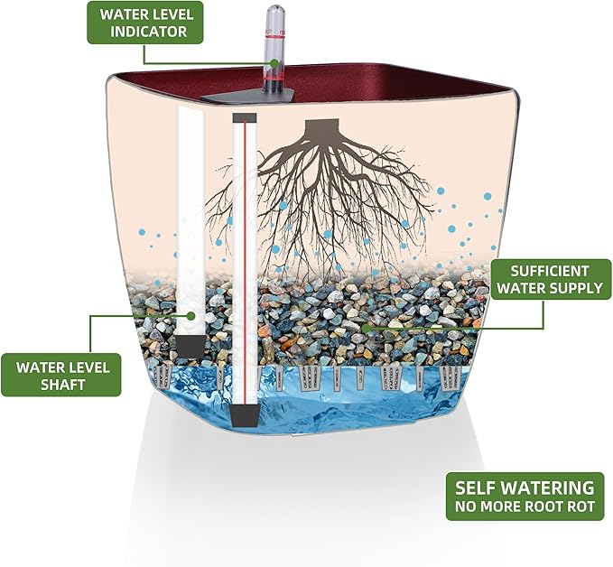 • SELF WATERING & NO MORE ROOT ROT - The smart unique sub-irrigation system is one of the most appealing aspects among all Dexceder planters. The easy-to-use separated integrated water reservoir or catcher- keeps your soil well aerated and automatic supplies plants with the right amount of ongoing moist air & nutrition for optimal growth. The insert indicator shows you the exact time to water again. The full water supply period can single-handedly last over 3 weeks based on different live plants