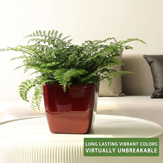 Dexceder 11x10 Self Watering Planter Indoor Outdoor, Inner Mat Design, Thickened Table Flower Plant Pot with Water Level Indicator (Red High Gloss)