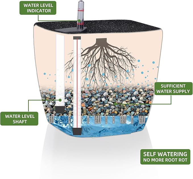 • SELF WATERING & NO MORE ROOT ROT - The smart unique sub-irrigation system is one of the most appealing aspects among all Dexceder planters. The easy-to-use separated integrated water reservoir or catcher- keeps your soil well aerated and automatic supplies plants with the right amount of ongoing moist air & nutrition for optimal growth. The insert indicator shows you the exact time to water again. The full water supply period can single-handedly last over 3 weeks based on different live plants