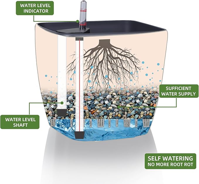• SELF WATERING & NO MORE ROOT ROT - The smart unique sub-irrigation system is one of the most appealing aspects among all Dexceder planters. The easy-to-use separated integrated water reservoir or catcher- keeps your soil well aerated and automatic supplies plants with the right amount of ongoing moist air & nutrition for optimal growth. The insert indicator shows you the exact time to water again. The full water supply period can single-handedly last over 3 weeks based on different live plants