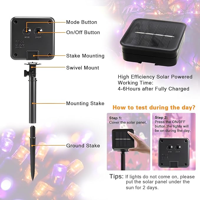 • 【Versatile Outdoor/Indoor String Lights】Solar Halloween string lights with a total of 6 strings allow you to be more flexible with your imagination and can be easily installed wherever you need to decorate. The solar lights can be molded into various shapes for gardens, patios, trees, porches, roofs, fences, bistros, restaurants, hotels, commercial buildings. It can also be used for parties, Halloween and New Year parties to create a warm and joyful holiday atmosphere.
