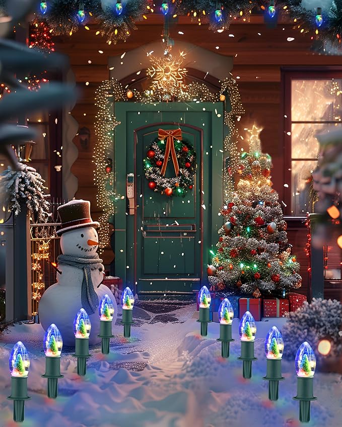 • 20 Constant LED Pathway Lights: 24.57ft C9 pathway christmas lights with 12 inch bulb spacing, 20 christmas light stakes. Safer UL certification compatible with E17 socket, colorful lighting effect for road, garden, yard, holiday decoration