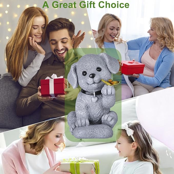 • Charming Dog Statue with Butterfly Solar Light: Handcrafted from eco-friendly resin, this delightful dog statue features intricate detailing and an adorable expression. The solar-powered butterfly light on its paw adds a magical glow to your garden or yard, enhancing its beauty at night.