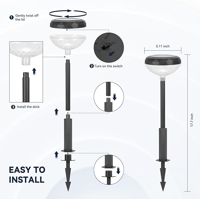 • 2 Install Ways & Solar Powered & Maintenance-Free: Easy setup - use as ground lights with stakes or place on flat surfaces. 100% solar-powered, these lights auto-charge by day and illuminate at night. Designed for practicality, they save labor and reduce electricity bills. Enjoy hassle-free, eco-friendly outdoor lighting for your backyard and lawn.