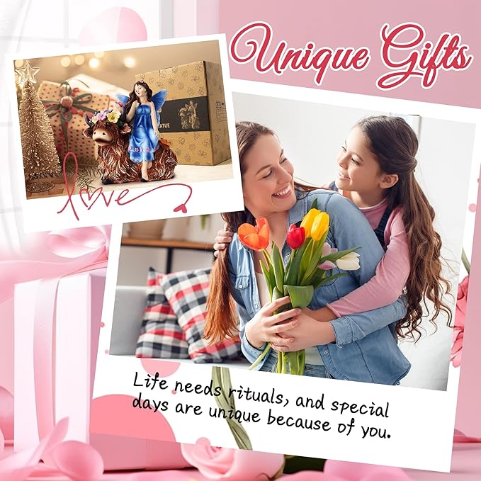 • 【Design and Aesthetics】The length, width and height of this statue are 7.2 x 7.8 x 4.3 inches.This enchanting statue features a beautiful fairy sitting atop a friendly Highland cow adorned with a lovely flower crown. The fairy gently holds a butterfly in her hand, adding a fairy-tale charm to your garden, yard, or patio.